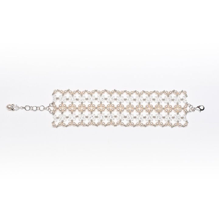 Inspired by patterns from ancient Greece, delicately woven Swarovski crystal and pearls form wrist wear fit for a modern day goddess.
